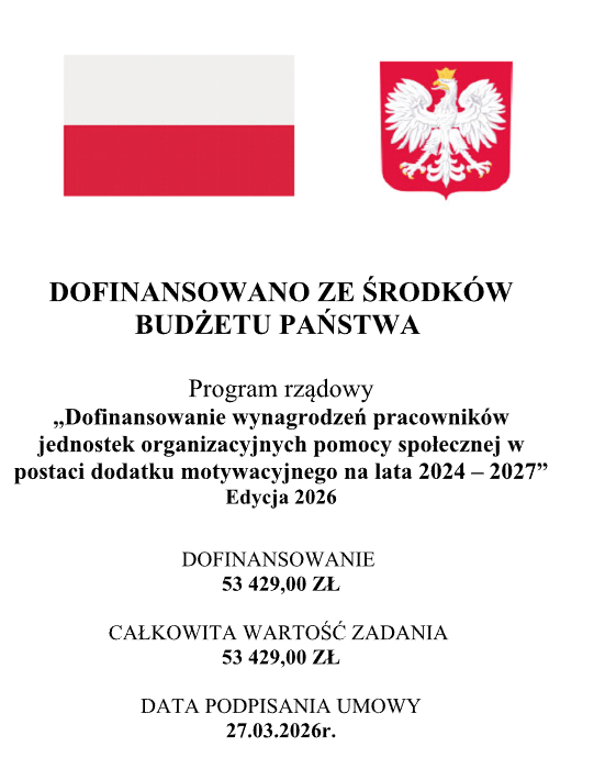 Informacja o dofinansowaniu wynagrodzeń pracowników jednostek organizacyjnych pomocy społecznej w postaci dodatku motywacyjnego na lata 2024–2027 Podstawa prawna Programu: Podstawą prawną rządowego programu "Dofinansowanie
